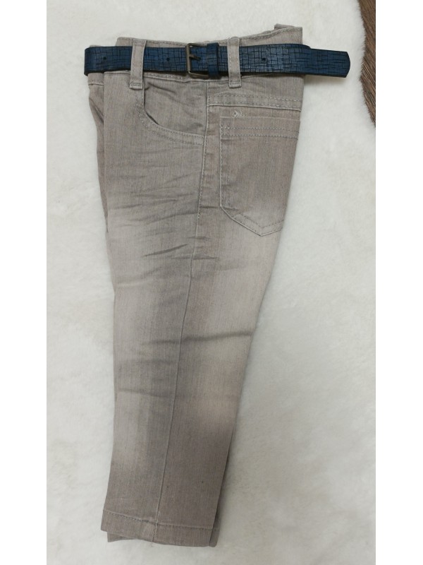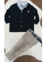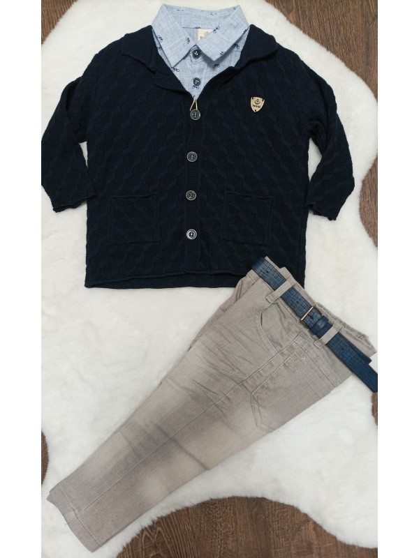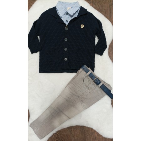 3-dielna športovo elegantná súpravička obsahuje rifle s mäkkej rifľoviny, košielku krátky rukavá so vzorom a modrý svetrík so štýlovým znakom.