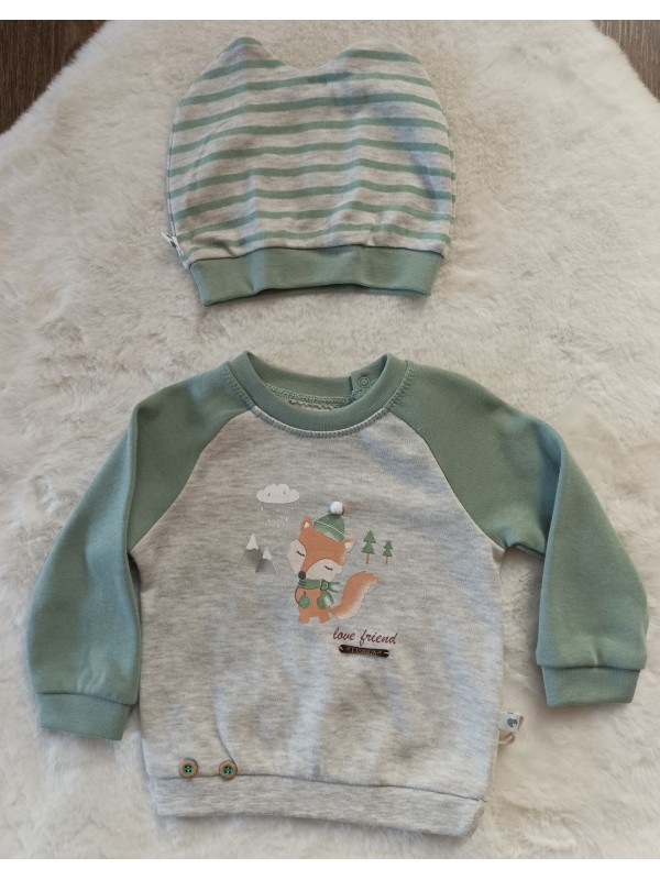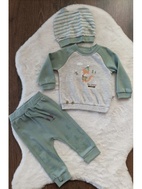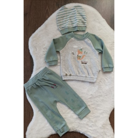 Detská 2-dielna súpravička Fox. Súčasťou súpravičky sú tepláčky, ľahká mikinka s roztomilou aplikáciou líštičky  čiapočka.