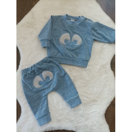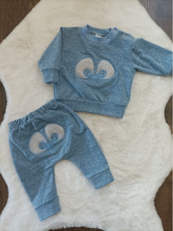 Detská 2-dielna súpravička Macko. Súčasťou súpravičky sú tepláčky a mikina. Mikinka je dozdobená aplikáciou medvedíka. Teplákáčiky majú pohodlný znížený sed a taktiež zadnú stranu zdobí medvedík.