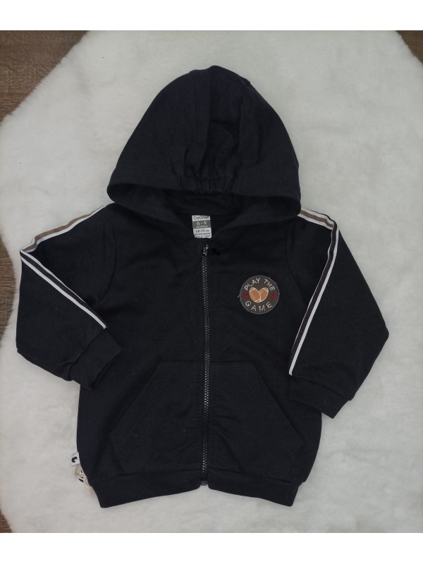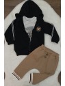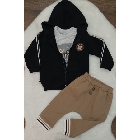 3-dielna súprava obsahuje štýlovú mikinu na zips s kapucňou, tričko a tepláčiky so sníženým sedom dozdobené drevenými gombíkmi.
