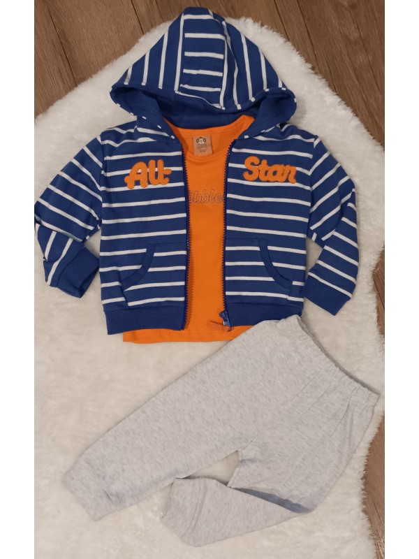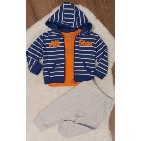 Športová 3-dielna súpravička. Obsahuje štýlovú pružkovanú mikinku na zips, tepláčiky a tričko.