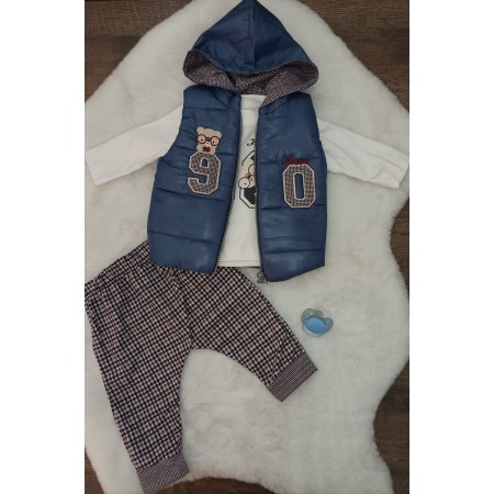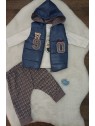 Praktická 3-dielna kojenecká súpravička pre bábätká. Súpravička sa skladá z trička, tepláčkov a vesty bez rukávov. Vesta a tričko sú zdobené štýlovým športovým číslom. Tepláčky majú pohodlný znížený sed a v páse majú široký pružný lem.