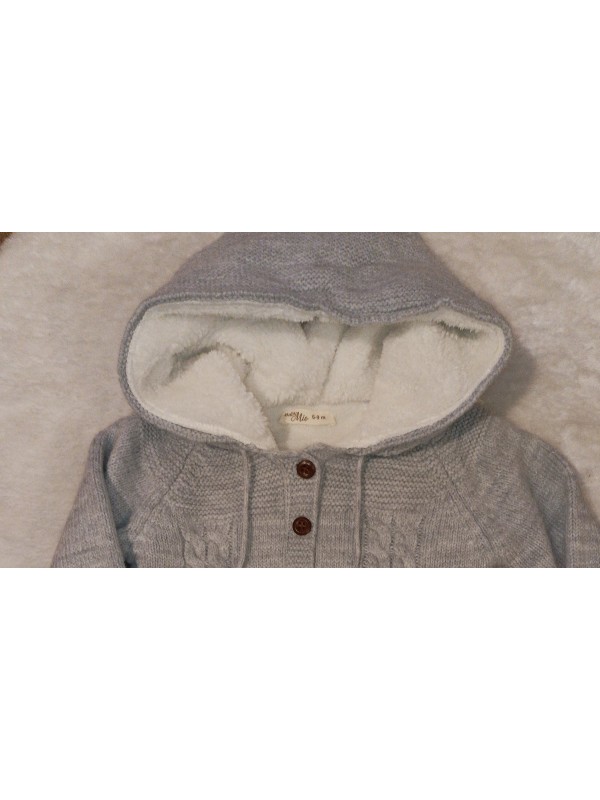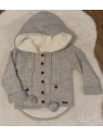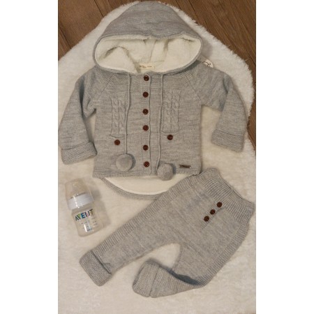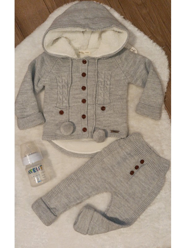 Detská 2-dielna súpravička Vlna. Súčasťou súpravičky sú nohavičky a svetrík s kapucňou.Svetrík je zateplený s kožúškom, vlnené nohavičky zdobia tri štýlové drevené gombíky ktoré dodávajú nohavičkám ten správny šmrc.