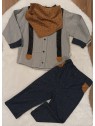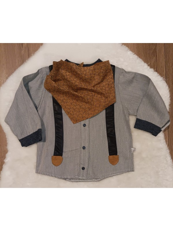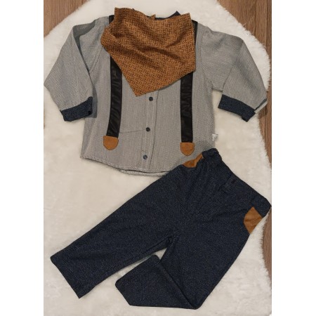 Krásna moderná súpravička, ktorá z vášho drobca urobí ozajstného chlapa. Obsahuje: nohavice, košieľku s imitáciou trakov a štýloú šatku, ktorá dodáva súpravičke ten správny šmrnc.