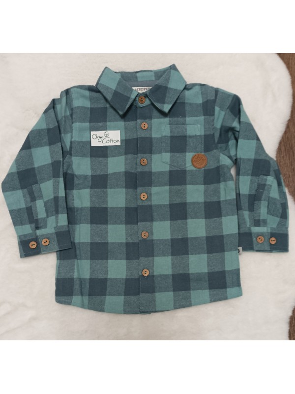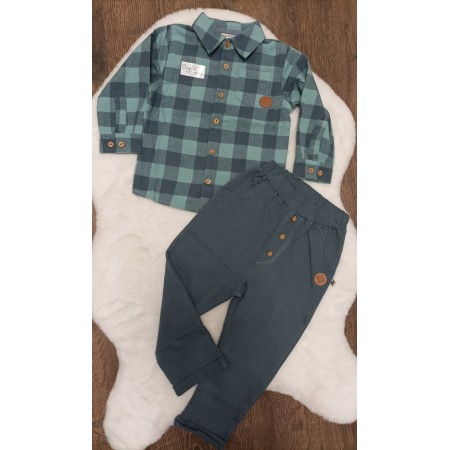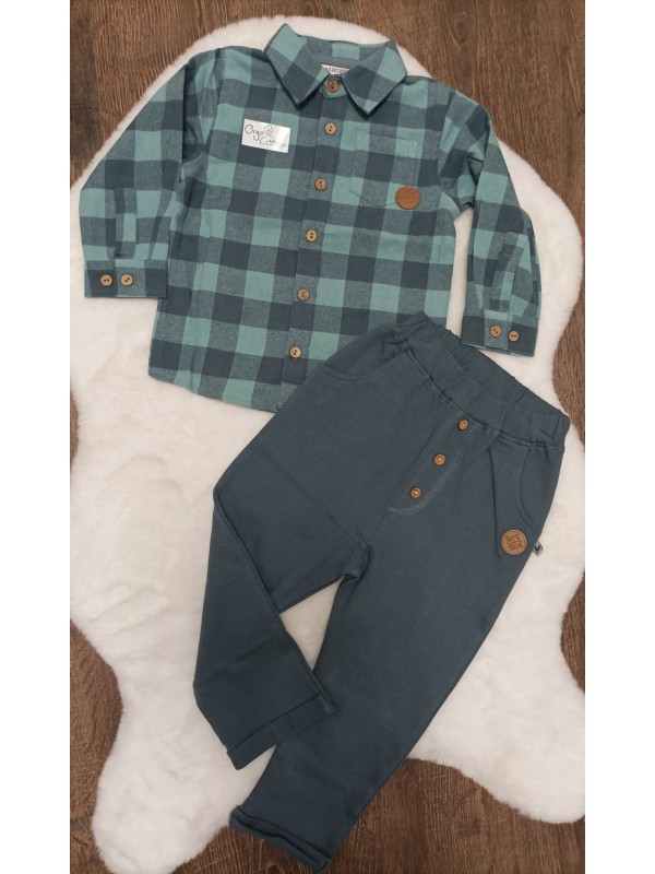 2-dielna súpravička obsahuje károvanú košieľku s drevenými gombíkmi a tepláčiky. Zloženie organická bio bavlna