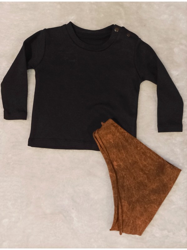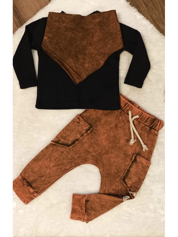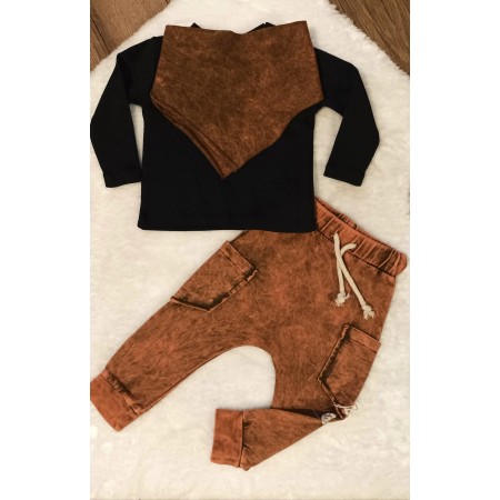 Moderná 3-dielna súpravička. Obsahuje štýlové tepláčiky so zníženým sedom, tričko a šatku. V súpravičke sa váš malý drobec premení na ozajstného "cool" chlapa.