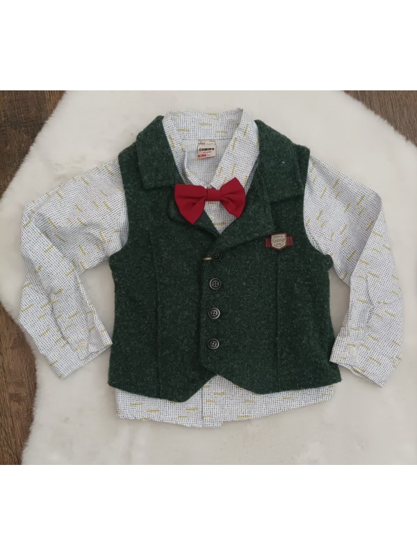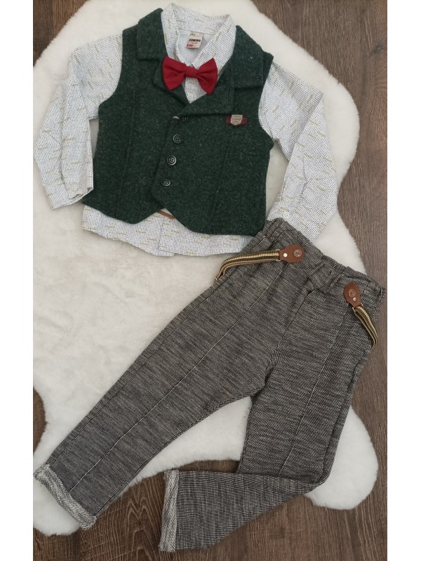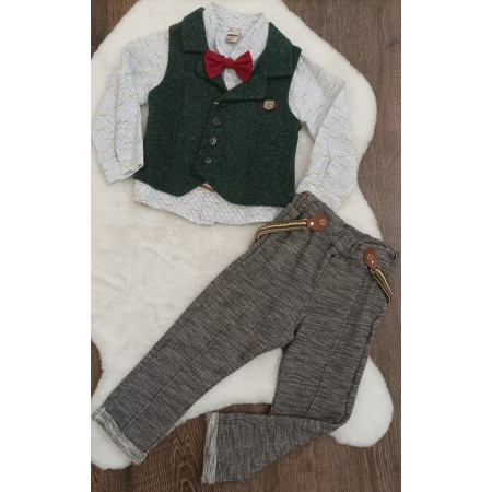3-dielna súprava obsahuje nohavice s trakmi, vzorovanú košielku s motýlikom a vestičku