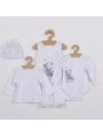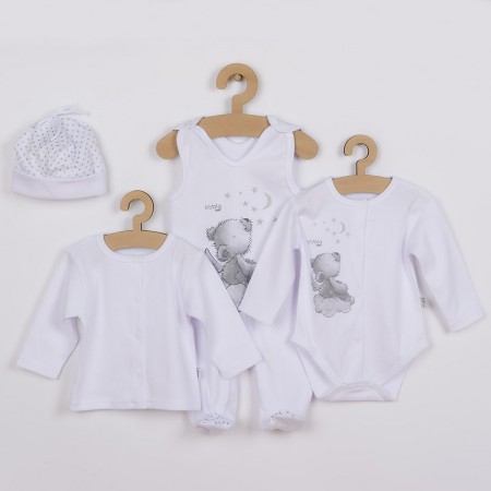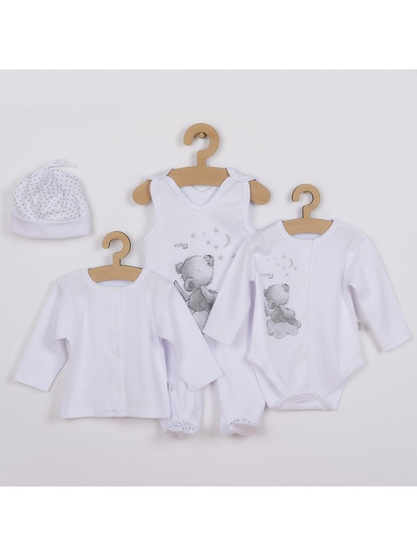 Nádherná bavlnená dojčenská 4-dielna súpravička Koala Angel pre bábätká. Súpravička je vyrobená z veľmi príjemného, mäkkého a kvalitného materiálu, ktorý je vhodný pre bábätká a je vhodná nielen do pôrodnice. Obsahuje body s dlhým rukávom, dupačky, kabátik a čiapočku. Celorozopínacie body zdobí obrázok medvedíka. Dupačky zdobí obrázok medvedíka a zapínanie je na cvočky na ramienkach a medzi nožičkami. Kabátik je jednofarebný so zapínaním po celej dĺžke. Čiapočka je zdobená bodkami a po obvode má široký pružný lem, ktorý netlačí na hlavičku bábätka a krásne kryje ušká bábätka. V tejto súpravičke, ktorá je precízne a kvalitne ušitá sa bude bábätko cítiť veľmi príjemne. Zloženie: 100% bavlna.