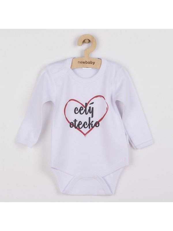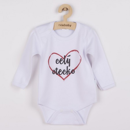 Originálne bavlnené dojčenské body s dlhým rukávom New Baby, s vtipným nápisom Celý otecko. Farby použité k potlači sú certifikované a vhodné pre bábätká. Je vyrobené z príjemného a kvalitného materiálu, v ktorom sa bude Vaše bábätko cítiť príjemne. Body má zapínanie na cvočky na ramienku a medzi nožičkami, čo uľahčuje obliekanie a prebaľovanie. Doprajte Vášmu bábätku vyniknúť v originálnom body. Zloženie: 100% bavln