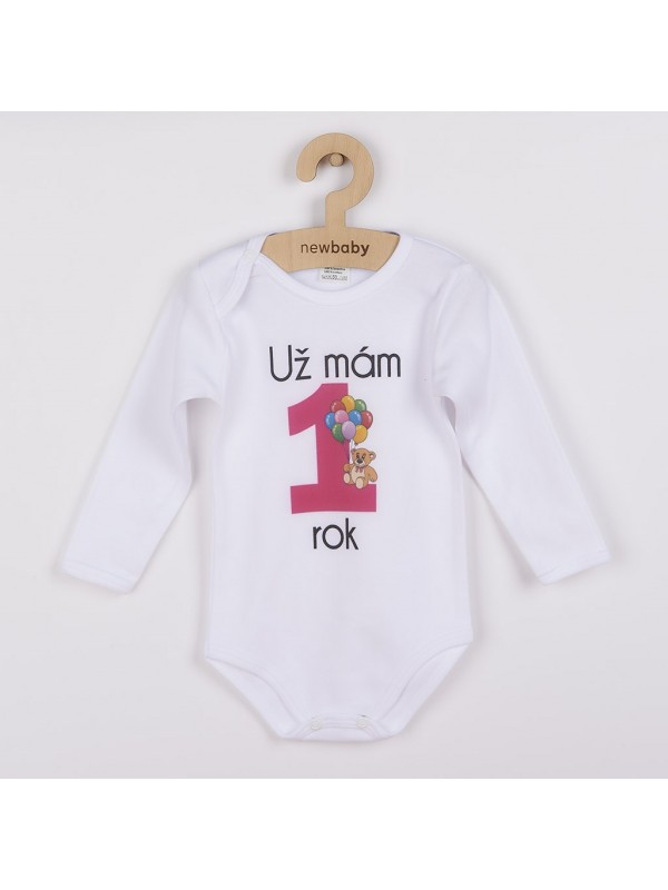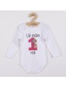 Originálne bavlnené dojčenské body s dlhým rukávom New Baby, s vtipným nápisom Už mám 1 rok a obrázkom veľkej jednotky s balónikmi. Farby použité k potlači sú certifikované a vhodné pre bábätká. Je vyrobené z príjemného a kvalitného materiálu, v ktorom sa bude Vaše bábätko cítiť príjemne. Body má zapínanie na cvočky na ramienku a medzi nožičkami, čo uľahčuje obliekanie a prebaľovanie. Doprajte Vášmu bábätku vyniknúť v originálnom body. Zloženie: 100% bavlna